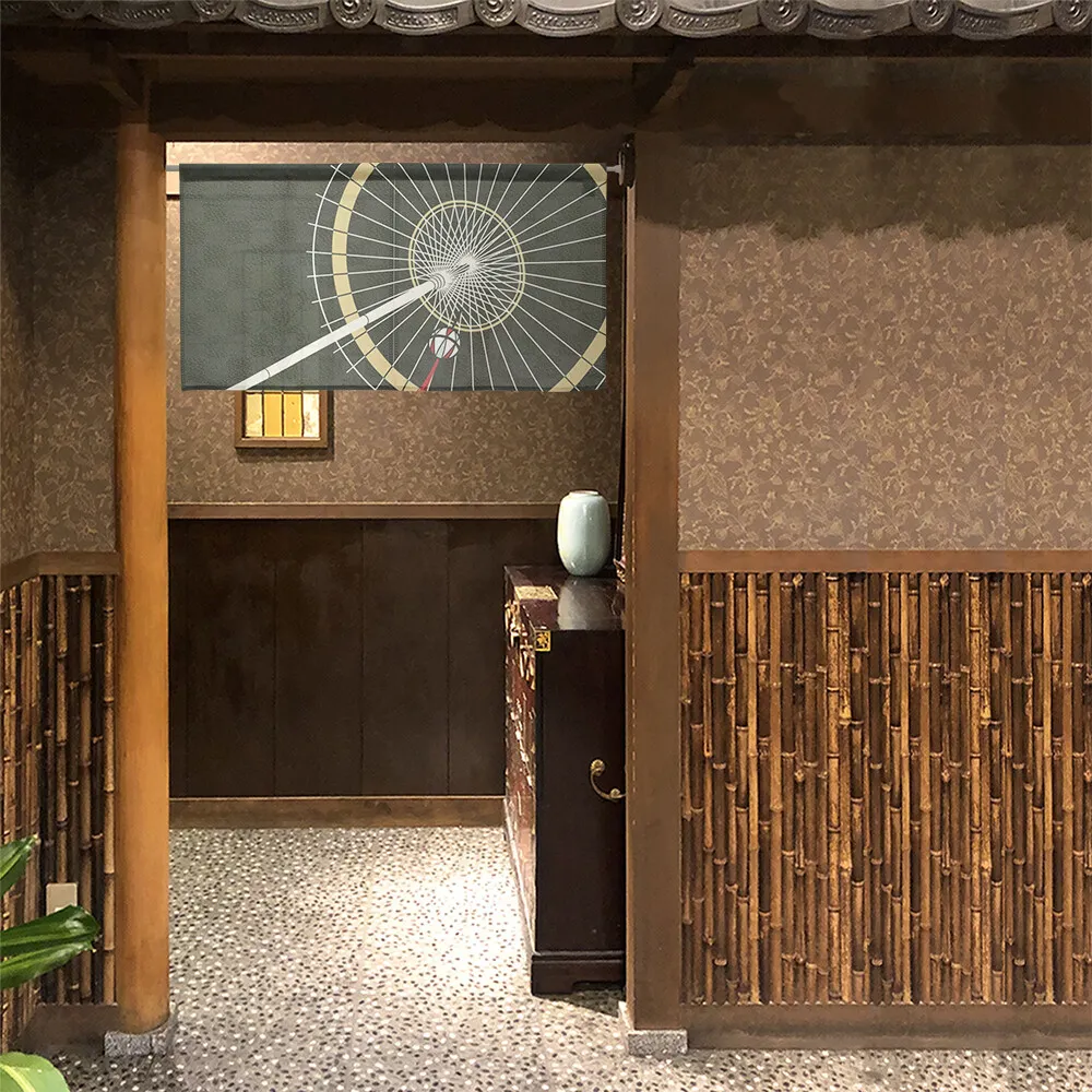 This noren (Japanese fabric curtain) features a decorative design of a traditional bangasa umbrella, a symbol of classical Japanese aesthetics.